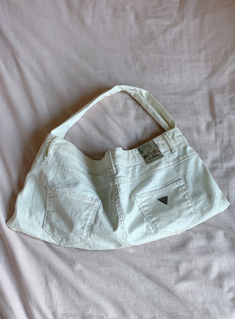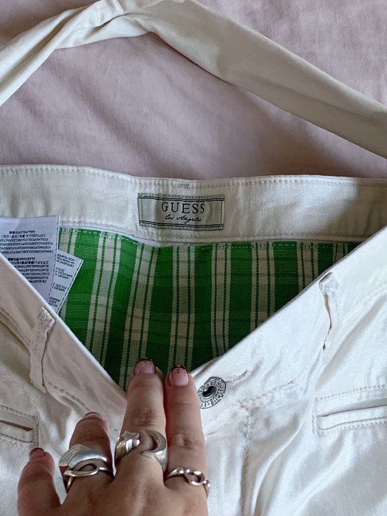 Up-cycled Guess cream trousers into Hendy’s bag. Lined with green checked pattern. Sustainably sourced fabric. Thin strap. Handmade by Hendy’s. Hendy’s ‘H’ logo hand embroidered onto front pocket. Small - medium sized bag.